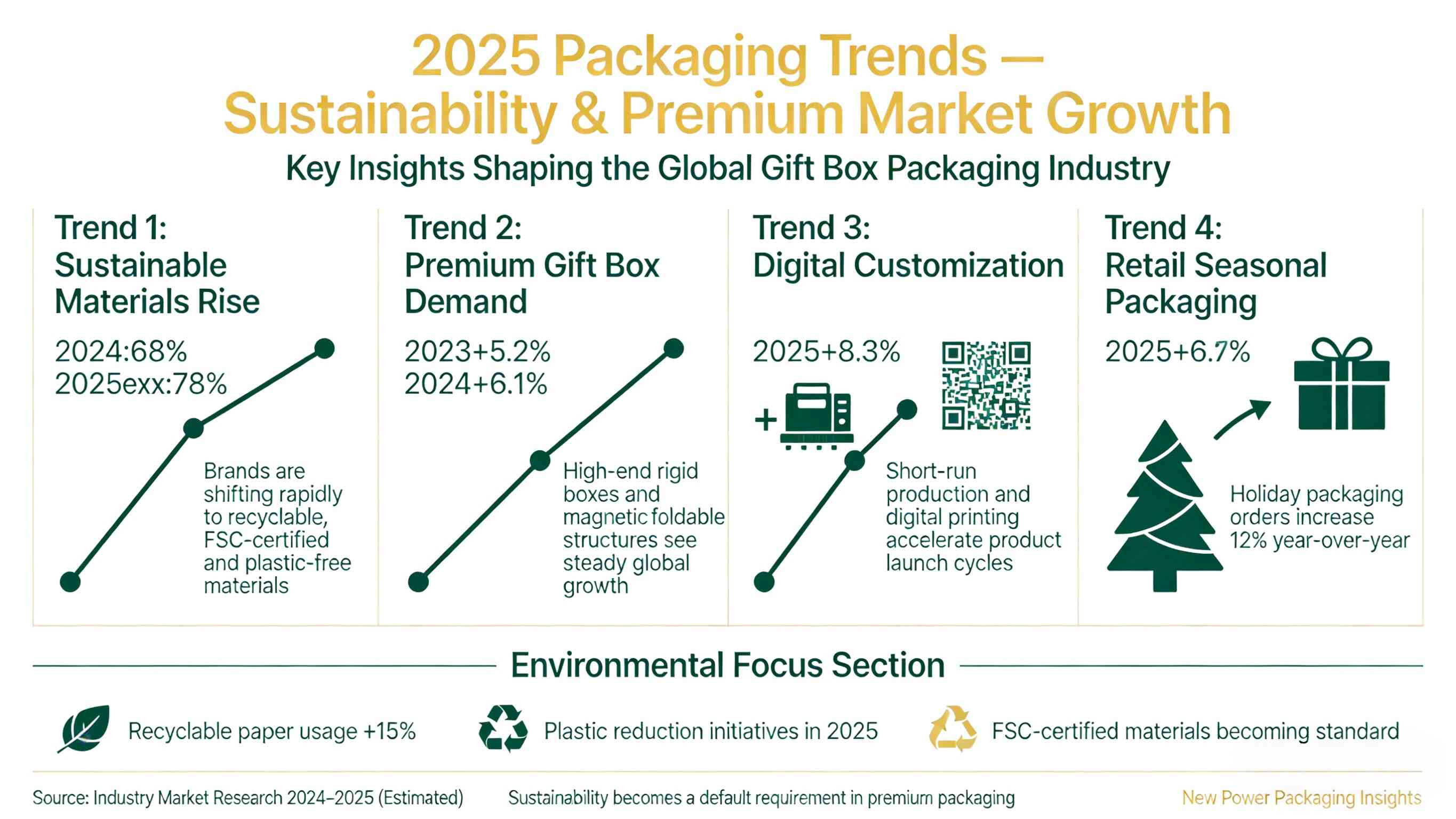 বাজার গবেষণার পূর্বাভাস: প্রিমিয়াম গিফট বক্স মার্কেট 2025 সালে 6%-9% বৃদ্ধি বজায় রাখবে টেকসই প্যাকেজিং সেগমেন্ট 12% এর বেশি ডিজিটাল প্রিন্টিং বৃদ্ধি পাবে এবং স্বল্প-চালিত কাস্টম অর্ডারগুলি দ্রুততম সম্প্রসারণ দেখতে পাবে, সামনের দিকে তাকিয়ে, 2025 সালে প্যাকেজিং শিল্প একটি স্পষ্টতা প্রতিফলিত করবে, উচ্চ গতির দিক হিসাবে আবেদন করবে, উচ্চ গতির দিক নির্দেশ করবে। প্রতিযোগিতামূলক প্রান্ত হিসাবে।
